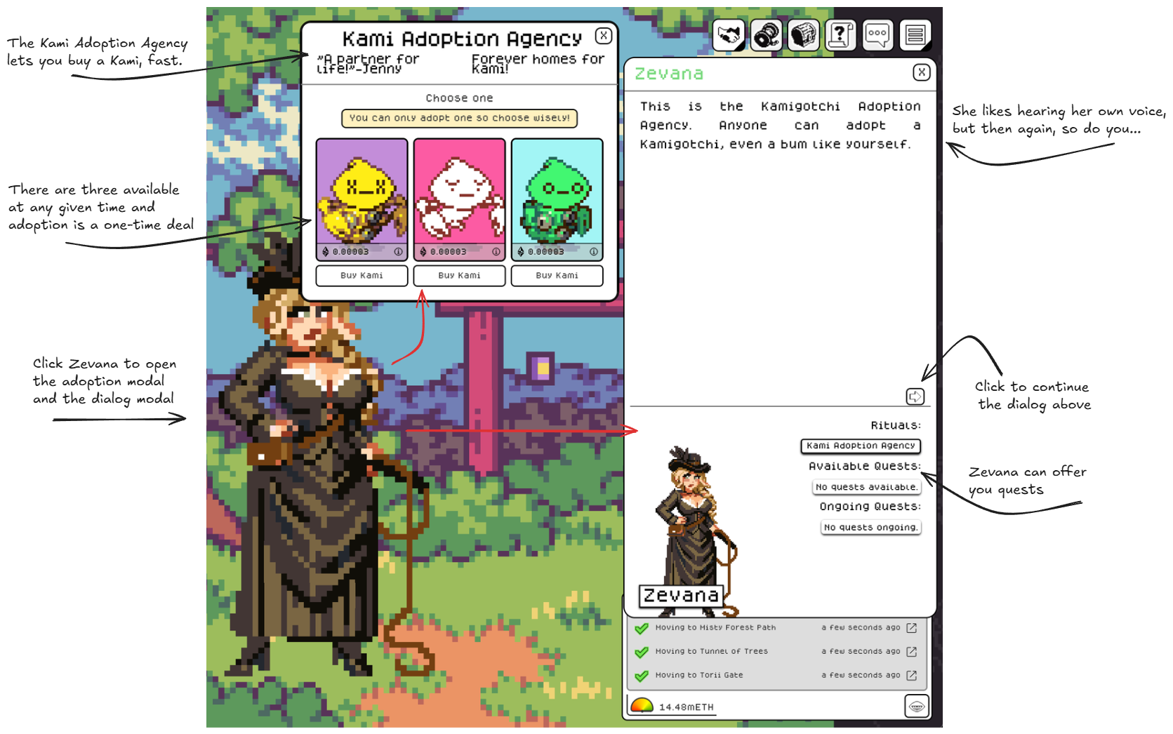While you're able to create an Account and walk through the world, if you want to advance in the game you'll need a Kamigotchi. The fastest way of getting one is by adopting them from Zevana. You can find her in Torii Gate, a few moves south from the starting location. Make sure you do her quests, they’ll teach you the basics of the game.