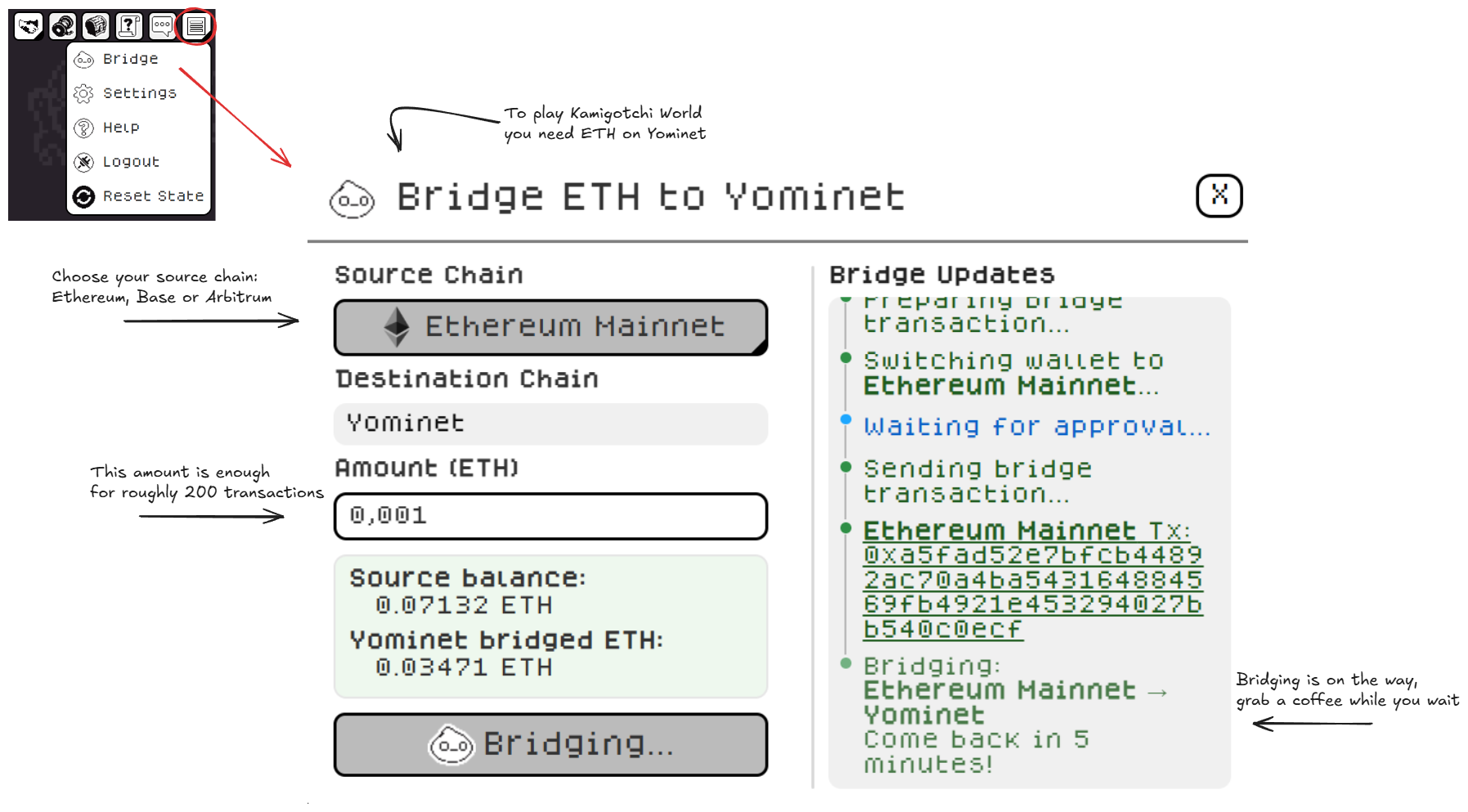 Yominet uses $ETH as gas. You can bridge $ETH to Yominet in a few simple steps. Select your source chain and the amount of ETH to transfer, then press Bridge to Yominet to initiate.