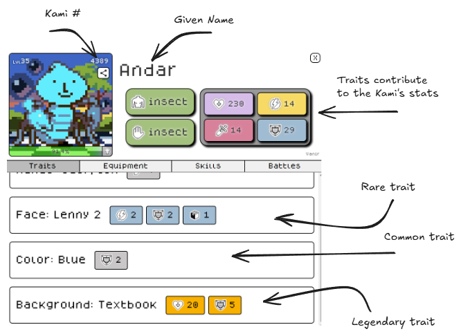 As well as the aesthetics, each trait provides some boosts to one a Kamigotchi's four [Stats](https://docs.kamigotchi.io/gameplay/kamigotchi/stats):